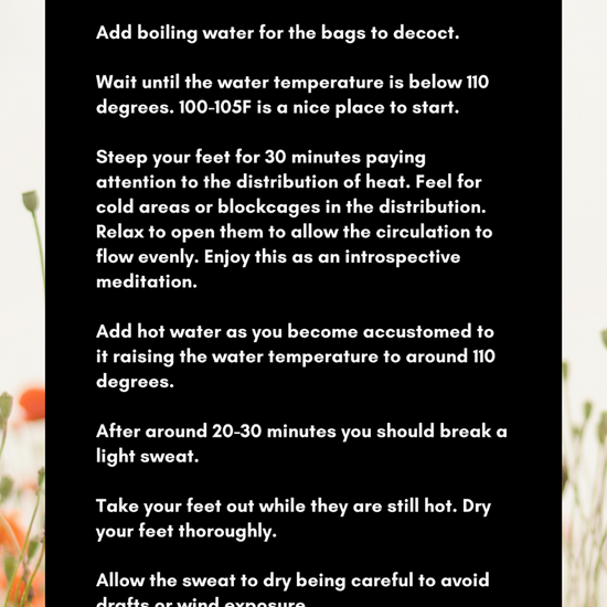 - Avoid foot soaks for any other conditions that are not suitable to move blood or increase circulation.